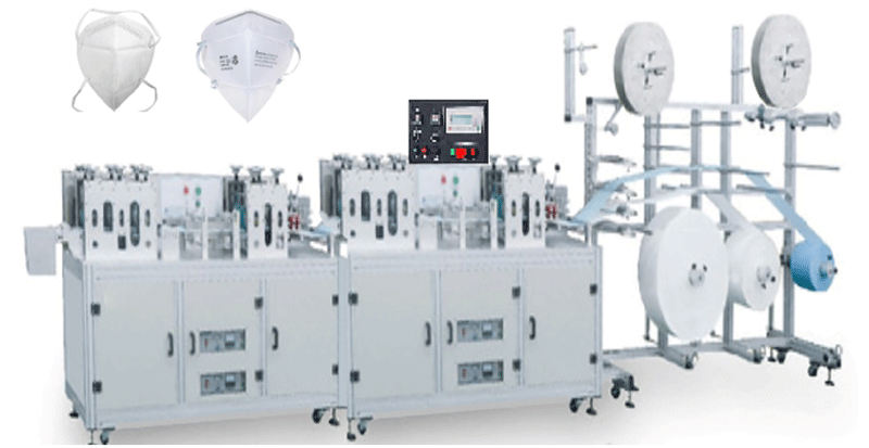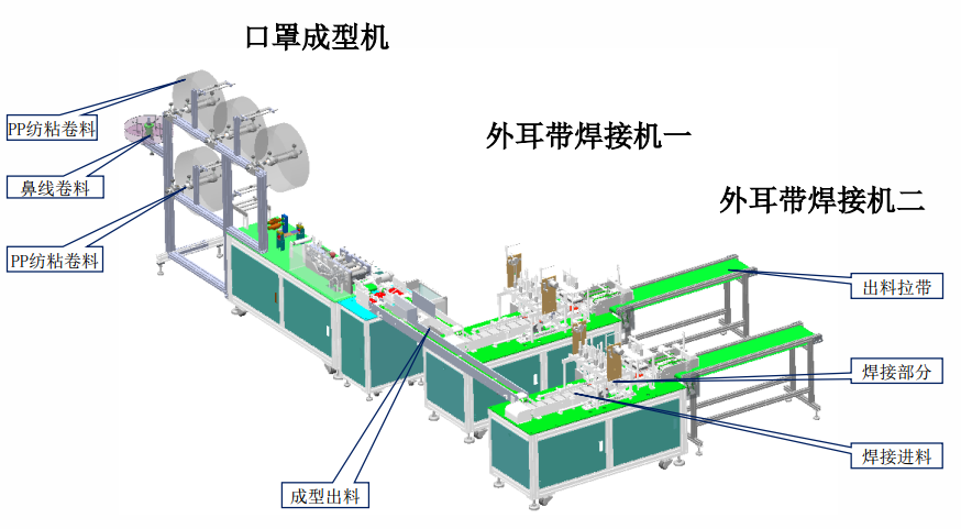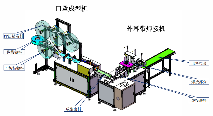 本設(shè)備主要生產(chǎn)平面口罩,由口罩成型機和外耳帶焊接機組成。從原材料卷料自動送料、鼻線插入、截斷、超聲波熔合、口罩自動裁斷、耳帶上料及焊接等均全自動完成。