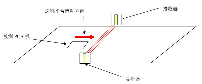 利用非接觸式影像測量技術,通過一對高精度激光位移傳感器,包括一個接收裝置和一個發射裝置,當覆銅板或PCB板經過這對位移傳感器時,有板的地方將會阻擋發射裝置發射的信號,從而在接收裝置上無法響應相應位置的信號。