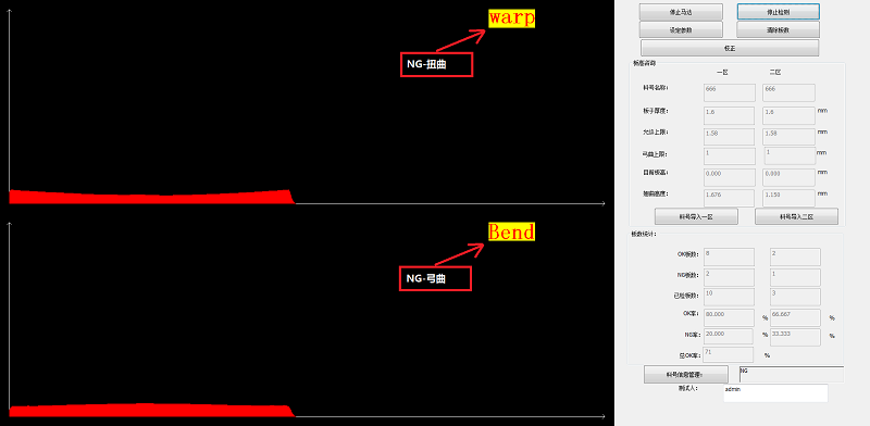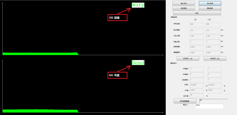 通過位置的信息可以得到PCB板的板厚曲線圖,通過特定軟件算法和翹曲度定義,計算出板翹曲度,并根據設定判斷條件得出OKNG板。