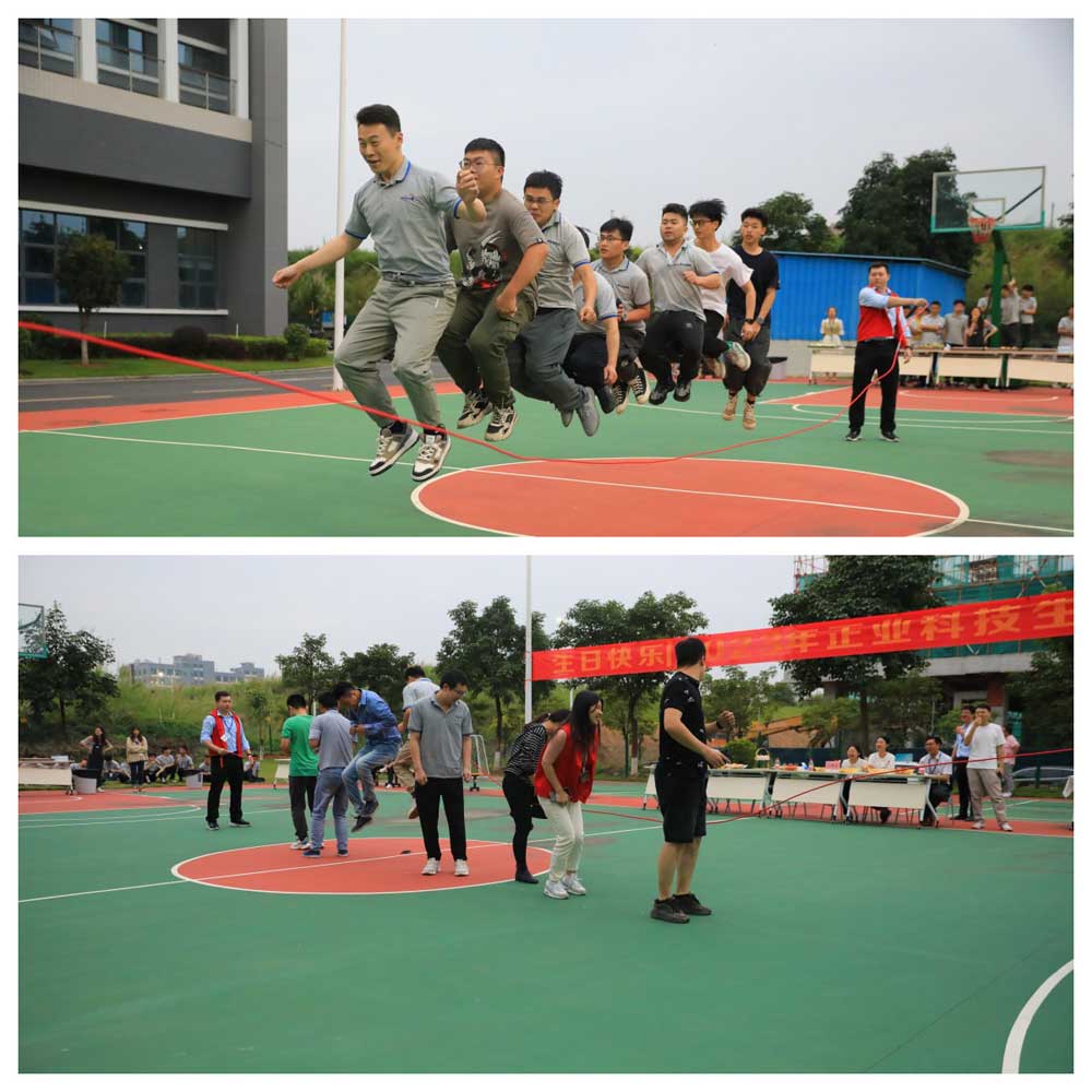 生日活動共有3個游戲項目:跳繩比賽、二人三足比賽、蒙眼吃西瓜,各隊伍分組角逐,奮勇爭先,積極參與到每一個游戲中。場下的隊友鼓舞吶喊,加油助威,現場氣氛活躍,展示了正業員工團結協作,友好和諧的團隊精神,整個游戲環節趣味橫生,氣氛熱烈,呈現了一場充滿歡聲笑語的歡樂盛宴。