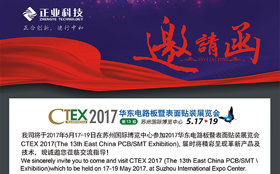 一年一度的華東電路板暨表面貼裝展(CTEX 2017)就要來啦!正業科技將隆重參加此展會,展示公司最新的技術成果,至誠邀請新老客戶參加蒞臨我司展位觀摩指導。