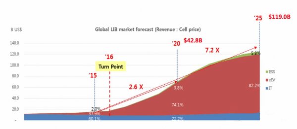 據(jù)SNE的預測截止2025年,全球動力電池市場需求將達到 1243GWh,產值將達到 979 億美元,動力電池的市場份額將占據(jù)整個鋰離子電池市場份額的82.2%左右,將對鋰離子電池行業(yè)產生決定性的影響。